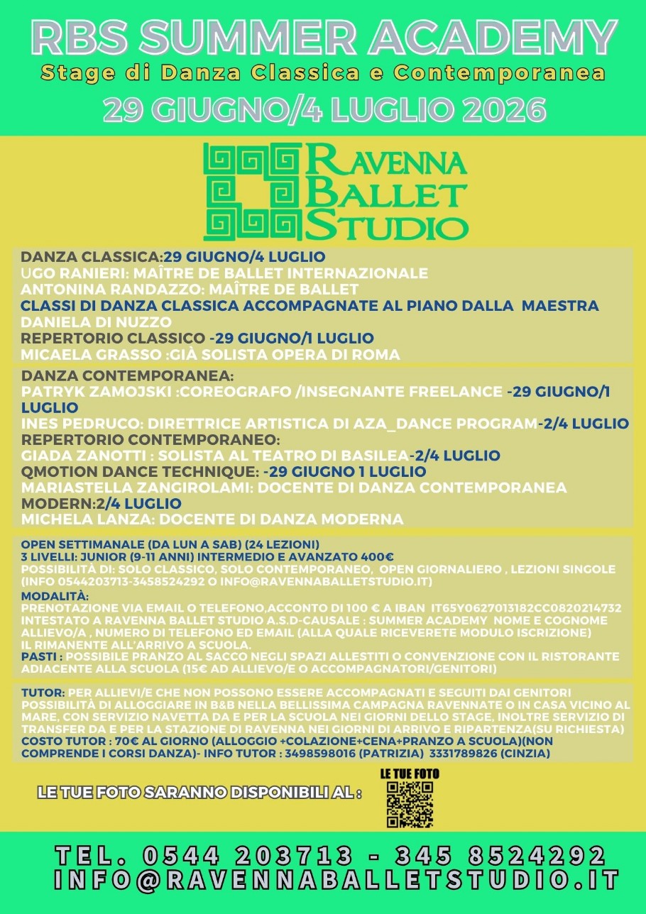intestato a Ravenna Ballet Studio a.s.d Causale :Summer Academy nome e cognome allievo/a ed un numero di telefono ed email (alla quale riceverete modulo iscrizione)